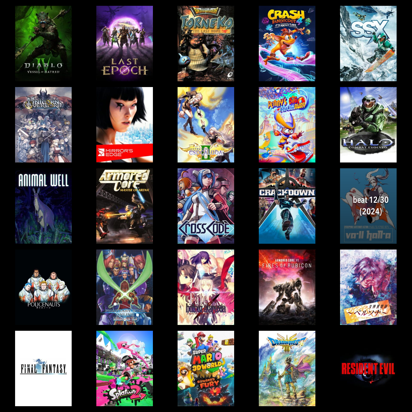Row 1: Diablo IV: Vessel of Hatred, Last Epoch, Torneko 2, Crash Bandicoot 4, SSX (2012)