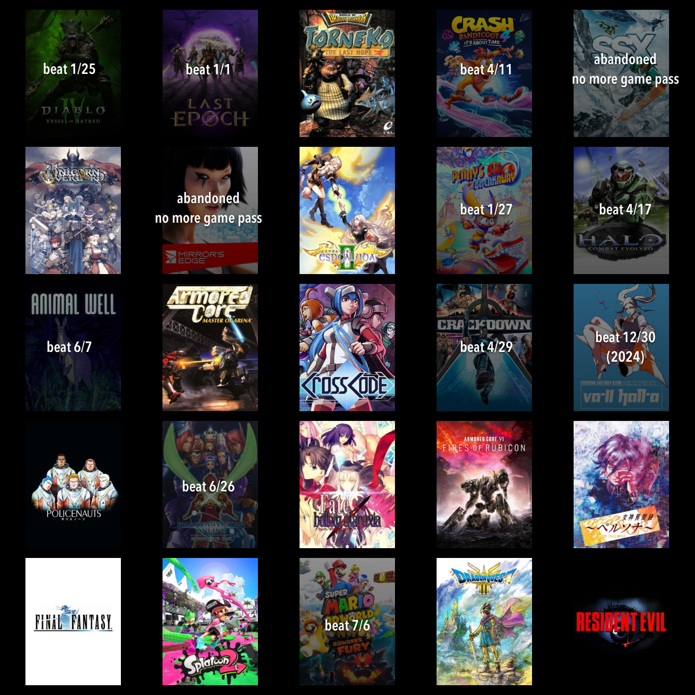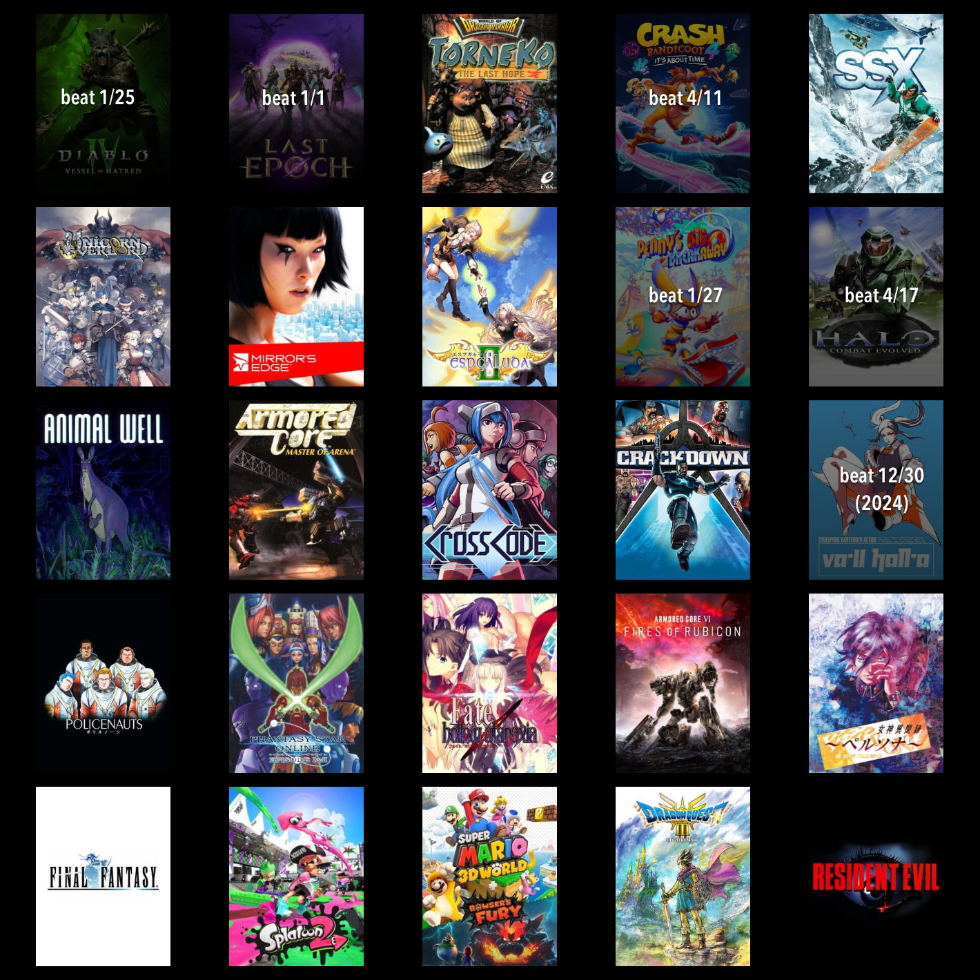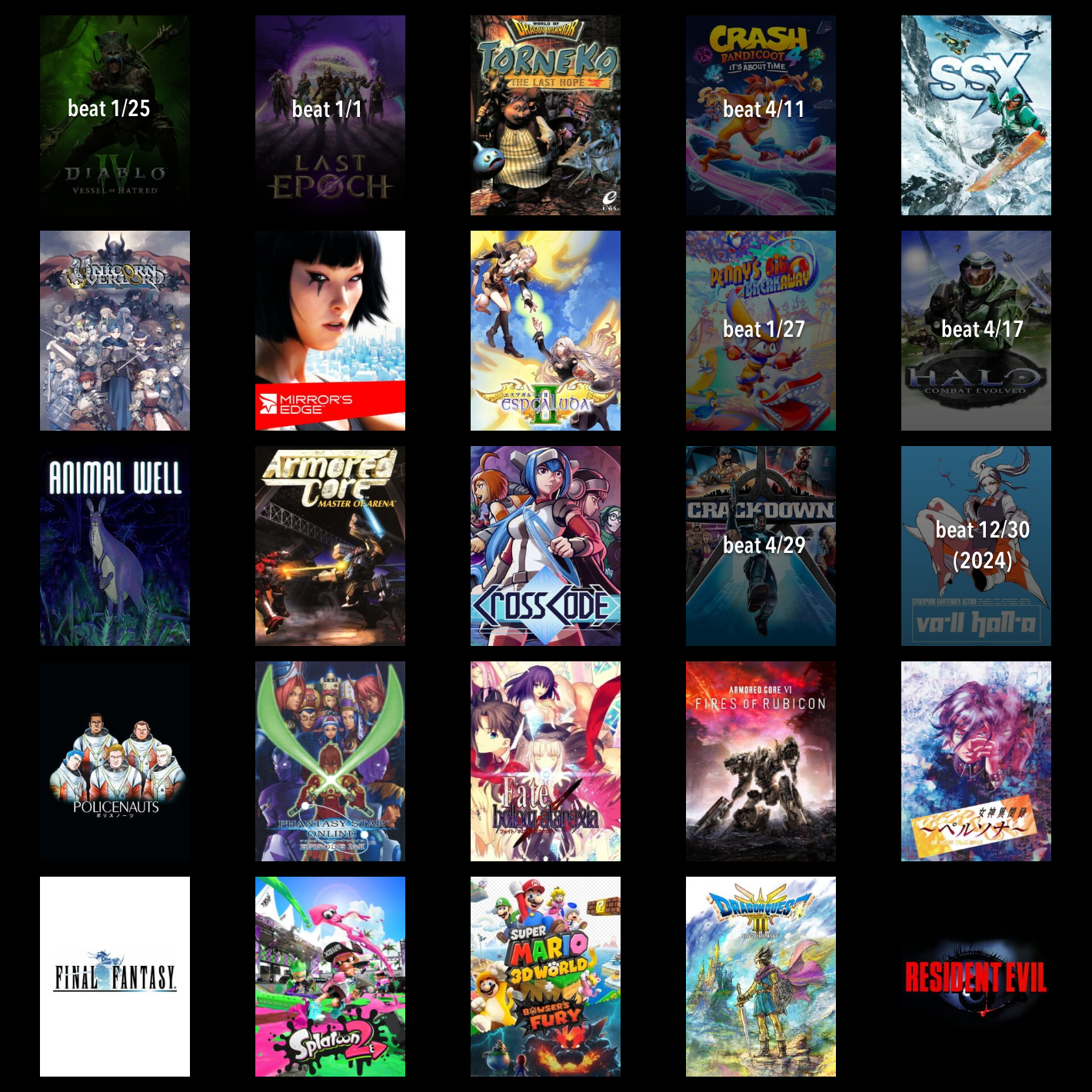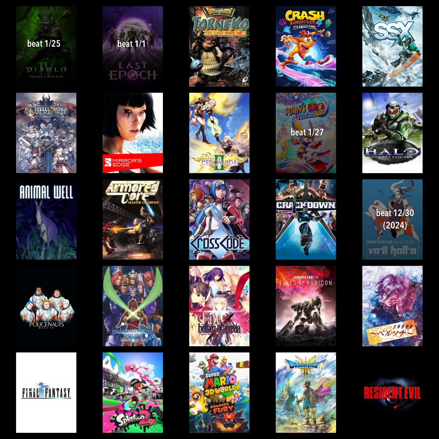 - 1/25: Diablo IV: Vessel of Hatred has such an anticlimactic ending that I didn’t realize I was actually beating it. Spiritborn has more interesting customization options, but then the bread and butter combat feels indistinguishable from base game classes. Somewhat disappointed with this one.